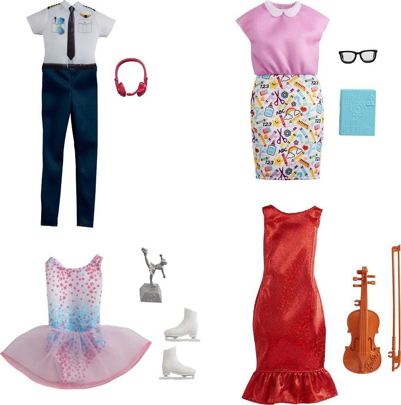 Choisissez parmi des coffrets thématiques comprenant 1 tenue de patineuse à glace, 1 look d'enseignante, 1 tenue de violoniste et 1 uniforme de pilote.