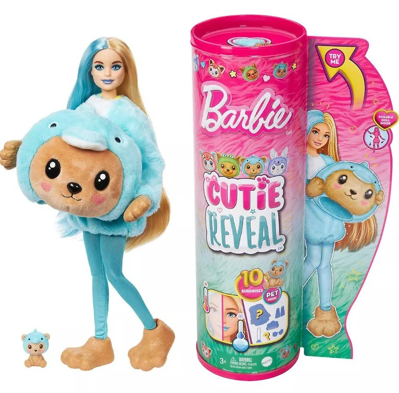 Avec 10surprises dans unseul coffret, les poupées Barbie CutieReveal de la série sur le thème des costumes font de la découverte du jouet une expérience adorable. Chaque coffret comprend des amis en peluche, des habillages et des éléments amusants qui se transforment! Quelle poupée allez-vous découvrir? Ouvrez l'emballage pour révéler un adorable ourson portant un costume de dauphin en peluche... tellement mignon! Soulevez la tête du costume pour dévoiler une poupée Barbie aux cheveux blonds rehaussés d'une large mèche bleue, avec des points d'articulation et des détails étincelants sur le visage! Ouvrez les 4sachets-surprises, qui contiennent des habillages et des accessoires, dont une paire de bottes, un sac à main dauphin, une paire de lunettes de soleil, un peigne et un adorable mini-animal assorti! Les enfants peuvent habiller et accessoiriser la poupée Barbie en retournant le haut du costume qui se transforme en veste polaire toute douce à imprimé tendance. La tête du costume devient, quant à elle, un petit lit pour le mini-animal! Les poupées Barbie CutieReveal de la série des costumes d'animaux renferment 10surprises et font de l'ouverture un moment absolument adorable! Découvrez un chaton déguisé en panda roux, un chien déguisé en grenouille, un ourson déguisé en dauphin ou un lapin déguisé en koala. Retirez le costume en peluche pour dévoiler une poupée Barbie articulée aux cheveux longs et colorés. Découvrez d'autres surprises à ouvrir comme une paire de chaussures, un sac à main et un mini-animal assorti. Retournez la veste en peluche pour en faire une veste polaire. La tête du costume se transforme en petit lit pour le mini-animal. L'eau glacée active le changement de couleur du visage de la poupée et du mini-animal. Utilisez de l'eau chaude pour revivre ces moments amusants à volonté! Les enfants vont adorer découvrir et collectionner toutes les adorables surprises de cette ravissante série Barbie CutieReveal. Chaque poupée est vendue séparément. Certains produits peuvent ne pas être commercialisés. Les poupées ne tiennent pas debout toutes seules. Les couleurs et les décorations peuvent varier.