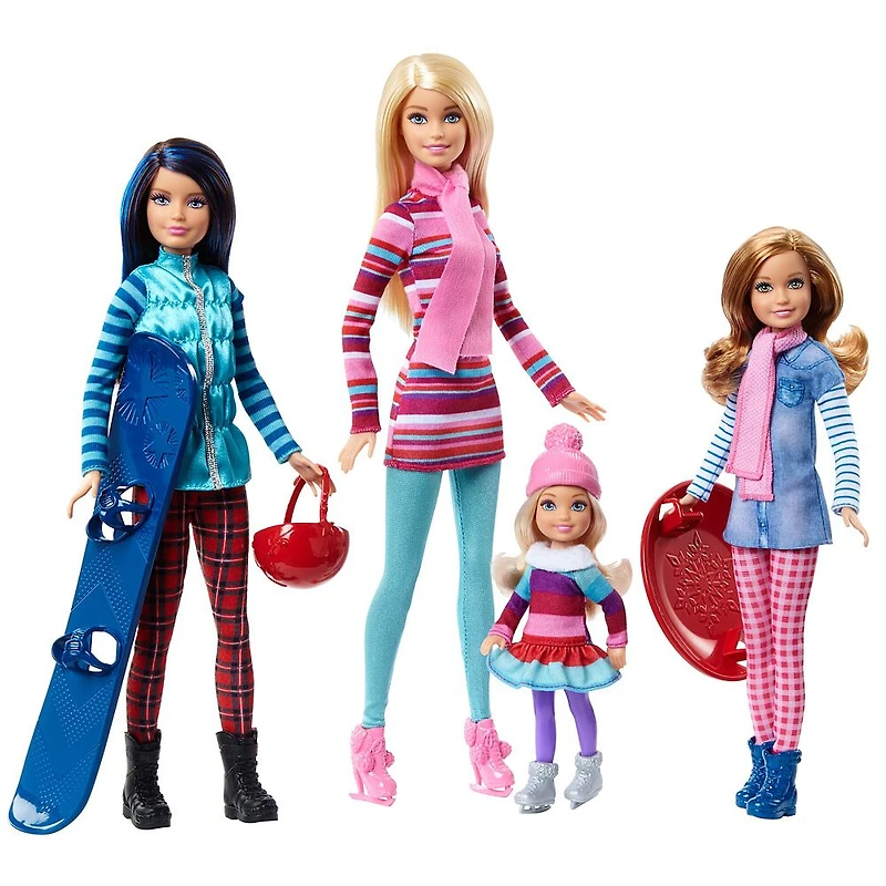 La poupée Skipper a une planche à neige, la poupée Stacie est assise sur un traîneau, et la poupée Barbie et la poupée Chelsea portent des patins à glace