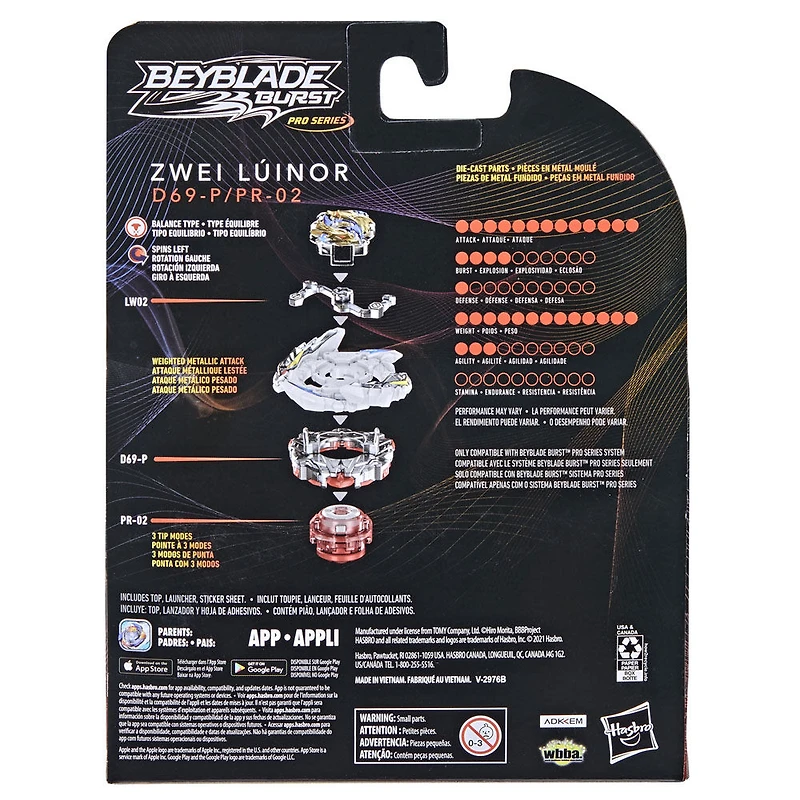 Inclut 1 lanceur Beyblade Burst Pro Series à rotation gauche et 1 toupie de compétition à rotation gauche Zwei Luinor D69-P PR-02. La toupie a des pièces en métal moulé pour accroître son poids, et des caractéristiques de performance au combat pour des compétitions intenses. La toupie de type équilibre Zwei Luinor a une couche d'énergie avec lest d'attaque métallique, une pointe de performance à 3 modes (peut changer de type endurance, à défense, et à attaque), une pastille GT à rotation gauche et une couche de lest.