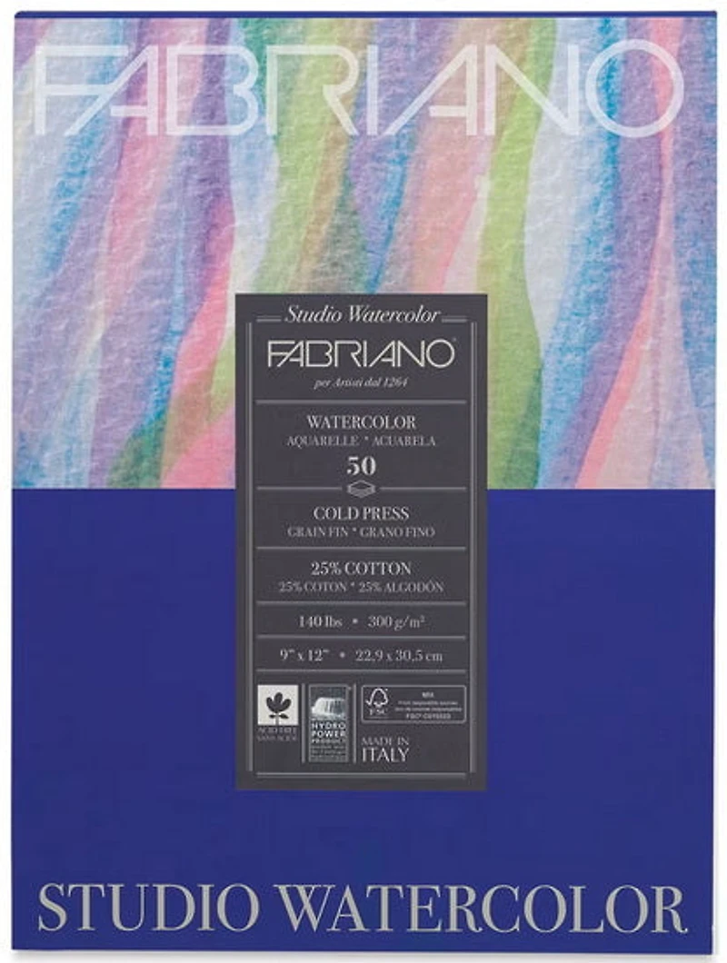 Le papier pour aquarelle Studio de Fabriano est fabriqué à l’aide d’un mélange de qualité alliant coton et cellulose sans lignine. L'absence d'acide le rend extrêmement résistant à long terme et le collage en masse et en surface assure une excellente absorption. Le rapport qualité-prix de ce papier garantit une offre exceptionnelle pour les étudiants des beaux-arts et pour les amateurs de dessin. Présentant un grain fin, il est idéal pour l'aquarelle, la gouache, l'acrylique, l'encre et le dessin. Poids : 300 g.