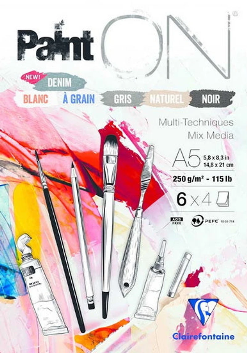 Le papier Paint'ON de Clairefontaine : un papier épais 100 % cellulose aux possibilités créatives infinies ! Convenant aux techniques mixtes, il est adapté tant aux techniques sèches (crayon, stylo graph, feutre) qu'aux techniques humides (encre de Chine, gouache, acrylique). Le papier multitechniques par excellence.Un assortiment de six papiers Paint'ON : la nouvelle teinte bleu denim, blanc, à grain, gris, naturel et noir. Idéal pour découvrir la gamme et choisir le papier qui vous conviendra le mieux. Excellente capacité d'absorption. Sans acide, certifié PEFC à 100 %.Contient 24 feuilles, 115 lb