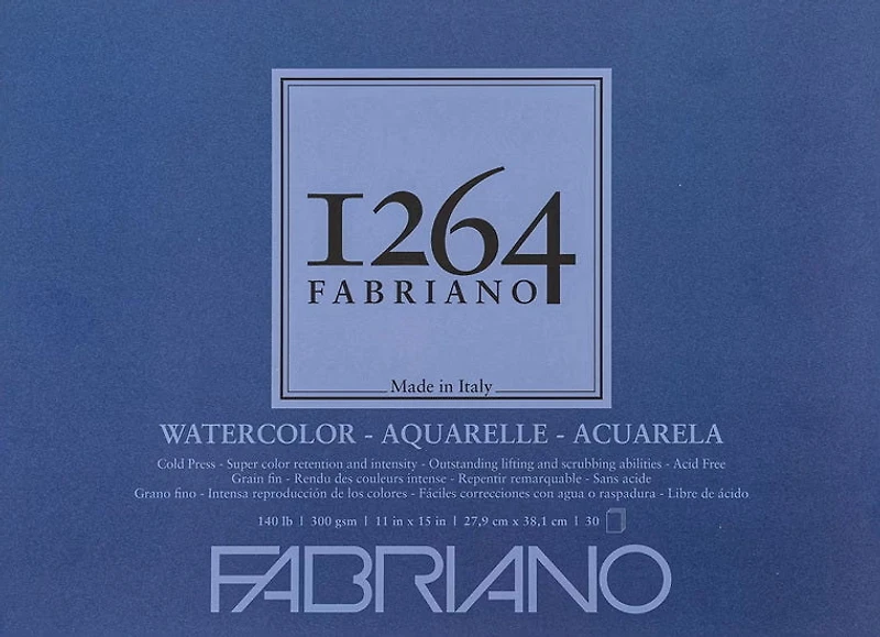 Les blocs pour aquarelle 1264 de Fabriano se distinguent par un papier texturé, sans acide et pressé à froid, présentant un blanc éclatant qui convient à toutes techniques humides : aquarelle, gouache, acrylique, encre acrylique, plume et encre, crayon et crayon de couleur. Le papier 100% vierge, à base de pulpe de bois, est fabriqué à partir d'énergie hydraulique et est certifié FSC.
