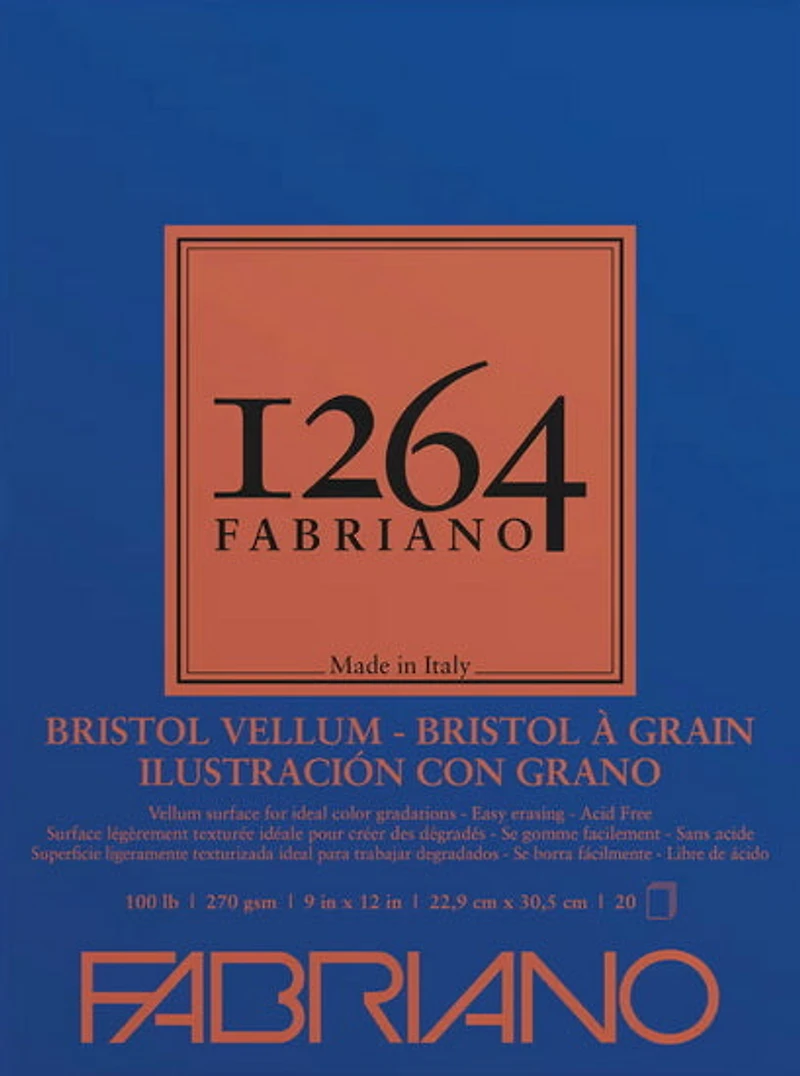 Les blocs Bristol 1264 de Fabriano sont disponibles dans un papier sans acide très blanc, soit lisse ou à grain. Bristol lisse présente une texture extra lisse avec une finition soyeuse, idéale pour les détails et les dessins techniques. Bristol à grain présente une texture moyenne, idéale pour l'illustration. Les deux permettent un effacement net et conviennent à plusieurs techniques : crayon, crayon de couleur, fusain, pastel, plume et encre, marqueur, aérographe et lavis léger d'aquarelle. Le papier est fabriqué à partir d'énergie hydraulique et est certifié FSC. Reliure collée.