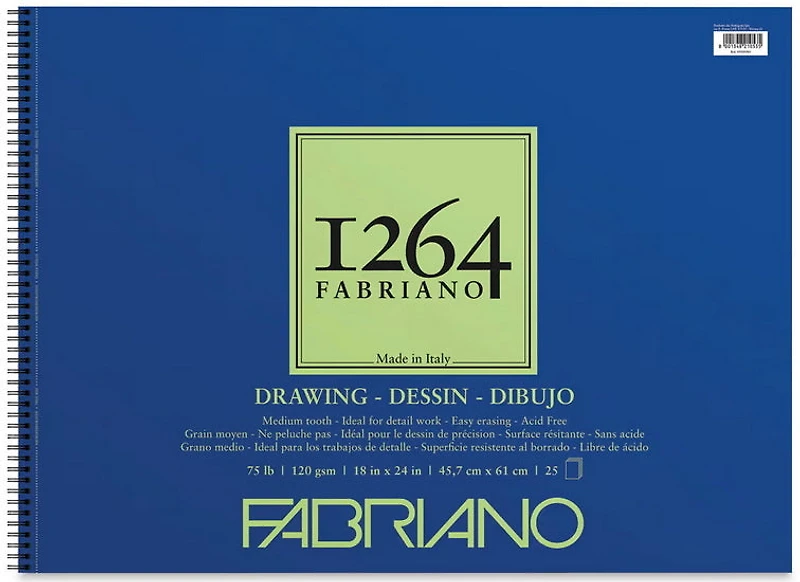 Les blocs à dessin 1264 de Fabriano se distinguent par un papier blanc doux, moyennement texturé et sans acide, avec une finition soyeuse qui permet d'obtenir de fins détails. Il permet un effacement net pour un travail final et permanent. Convient à plusieurs techniques : crayon, crayon de couleur, stylo, fusain, pastel, pastel à l'huile ou tout autre support sec. Le papier est fabriqué à partir d'énergie hydraulique et est certifié FSC. Reliure spirale avec microperforation.