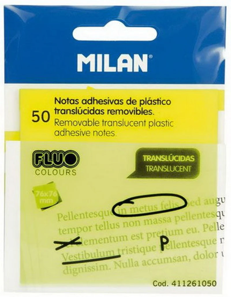 Notes adhésives en plastique translucides et amovibles. Ils permettent d’écrire facilement et d’ajouter des annotations au crayon ou au stylo. Couleur jaune fluo translucide. 76 x 76 mm.