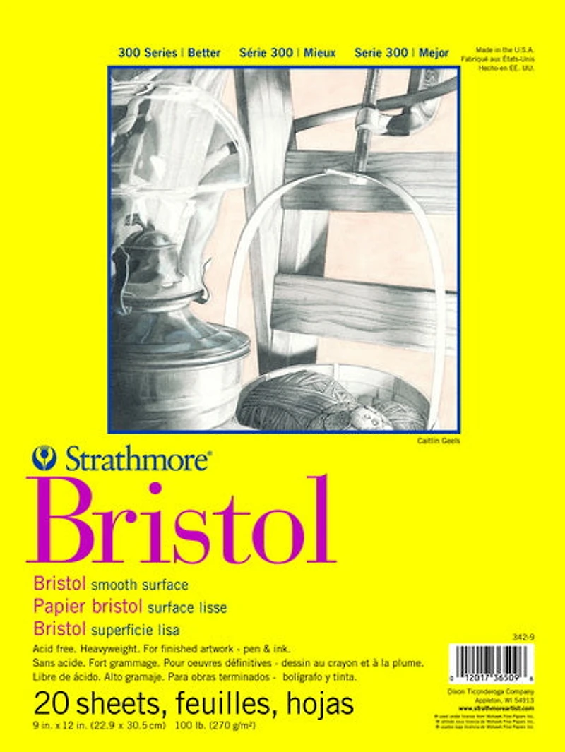 Le papier Bristol de Strathmore est un papier épais à la surface lisse et sans acide. Il est idéal pour les dessins à l'encre ou au crayon et se prête aussi aux oeuvres réalisées à l'aérographe