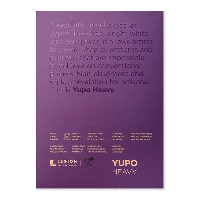 Un papier révolutionnaire. Sans arbre, d'un blanc éclatant et résistant aux taches, il permet aux artistes de créer des formes, des motifs et des nuances impossibles à réaliser sur les papiers classiques. Non-absorbant et lisse, il est une véritable révélation pour les artistes. Voici le Yupo Heavy.Sans acide, 100% polypropylène.