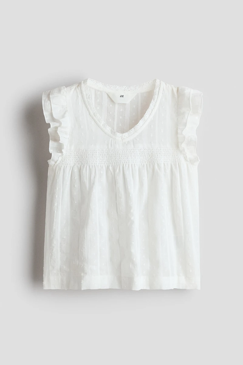 Blouse en tissu aérien. Modèle à encolure en V bordée de dentelle et manches volantées double épaisseur. Smocks devant et bas légèrement .
