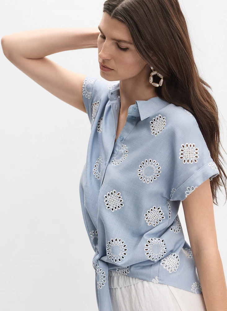 Nous aimons une option sophistiquée comme notre blouse boutonnée à broderies. Portez un look assorti avec les pantalons brodés. Broderies Col chemisier Boutonnée Détails en nœud à l'ourlet Manches roulées Matière en coton Longueur à partir de l'épaule : 23 po