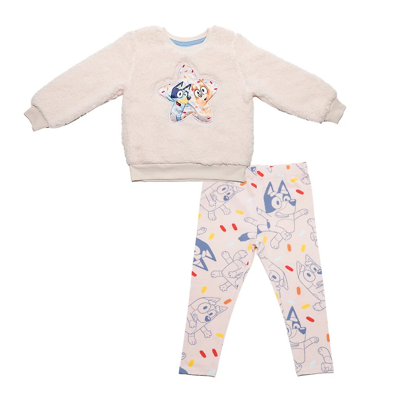 Cet ensemble Bluey deux pièces est de couleur blanc cassé! Le haut est orné d’un imprimé de deux personnages et rehaussé d’une applique sérigraphiée étoilée. Le bas arbore un imprimé Bluey intégral et des vermicelles. Le haut est fabriqué à 100 % en Sherpa de polyester et le bas est composé à 95 % de coton et à 5 % de jersey de spandex. Cet ensemble tendance et confortable à imprimé est un choix parfait pour la prochaine saison.