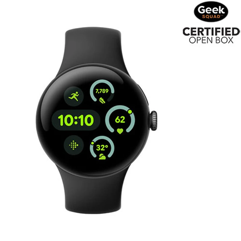 Ceci est un produit boîte ouverte certifié par la Geek Squad. Plus de renseignements ci-dessous. Profitez de la performance de la grande montre éclatante Pixel Watch 3 de Google. L'écran Actua à la fine pointe vous permet de voir facilement vos statistiques et vos renseignements, avec une grande surface d'écran deux fois plus lumineuse et réactive qu'avant. Battez vos records avec les fonctions de course avancées de Fitbit. Utilisez le tout nouveau suivi de la préparation et de la charge cardiovasculaire pour équilibrer le repos. Et restez au courant de votre journée avec l'aide de Google.
