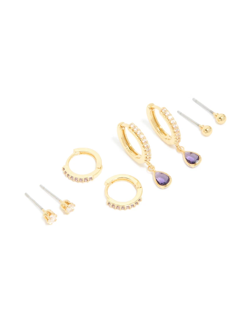 Boucles d’oreilles en pierres de naissance cubiques en laiton en laiton et améthyste plaquées or en paquet de 4