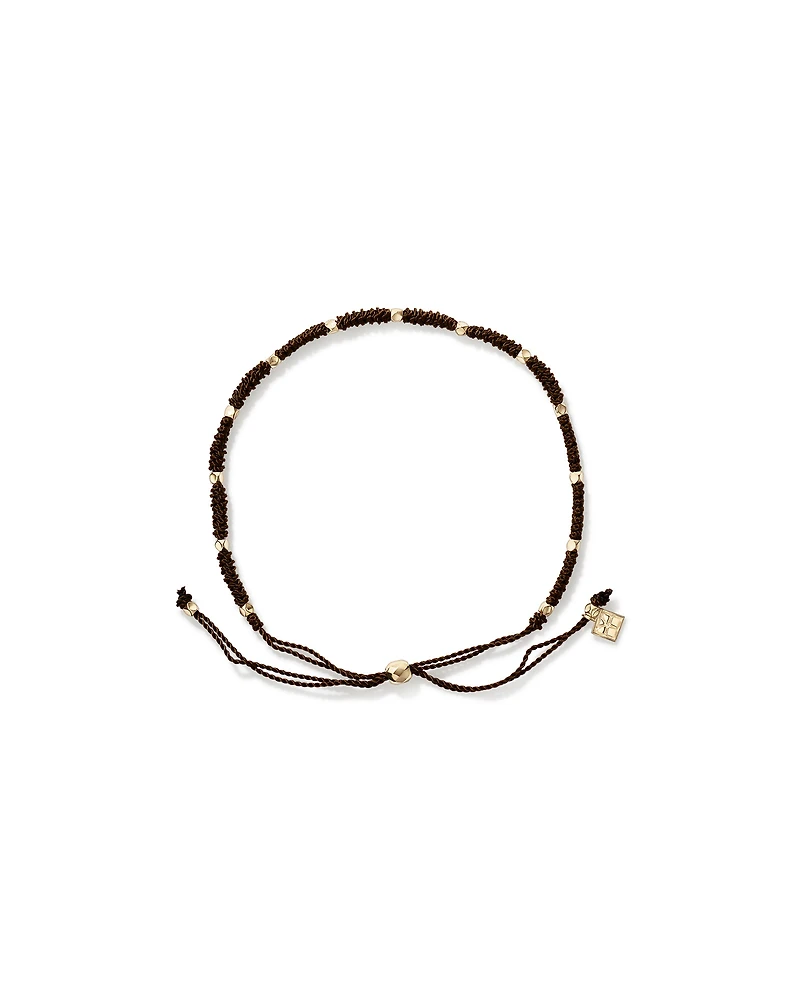 Fabriqué avec un cordon en nylon brun et des accents en or jaune 10 carats, ce bracelet ajustable présente des perles en or taillées en diamant. Un design polyvalent pour le quotidien.