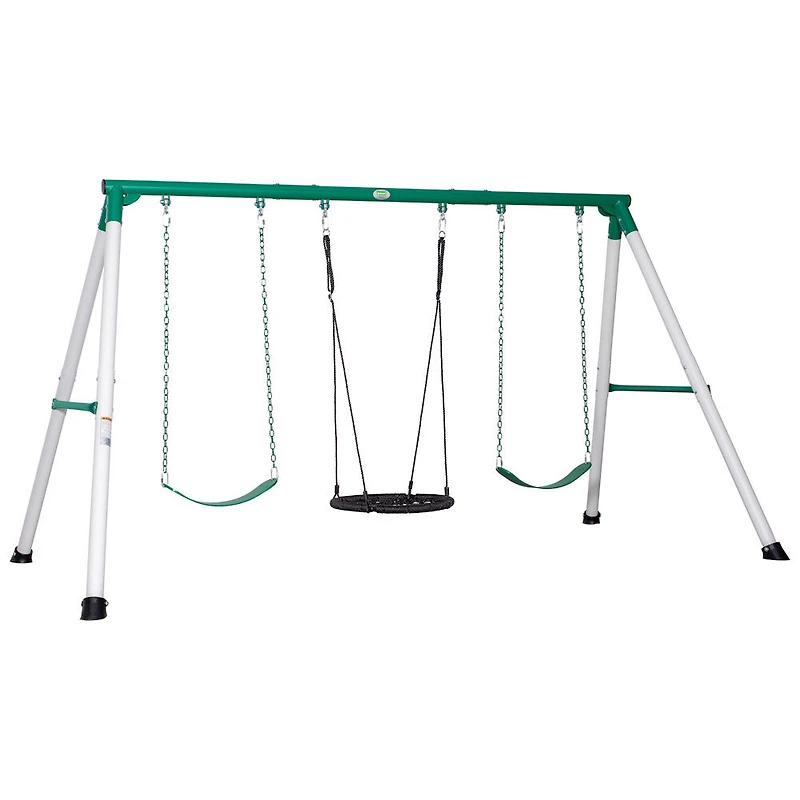Profitez de nombreuses de plaisir avec les 3 options de balançoire de notre nouvelle balançoire extérieure en métal Little Brutus. Avec Backyard Discovery, vous obtenez beaucoup plus qu'une balançoire métallique à cadre en A. Notre cadre de balançoire robuste est fait en acier épais thermolaqué pour créer une caractéristique durable de qualité supérieure qui durera plus longtemps que les produits concurrents et créera moins de stress en éliminant le besoin de teindre ou de peindre les ensembles de jeux en bois. 3 positions de balançoire à large voie sont équipées de 2 balançoires flexibles de 66 cm (26 pouces) à usage intensif et d'une balançoire nid. Les chaînes entièrement revêtues offrent les qualités anti-pincement et anti-accrochage que les parents apprécient. Cette balançoire résistante aux intempéries et nécessitant peu d'entretien est facile à construire et sera prête pour jouer en un rien de temps. Chez Backyard Discovery, nous nous engageons à créer une vie de souvenirs avec nos produits de jeux d'extérieur. Avec le nouveau Little Brutus, nous avons créé un moyen d'inclure même les plus jeunes enfants dans les avantages qu'apportent les activités de plein air.