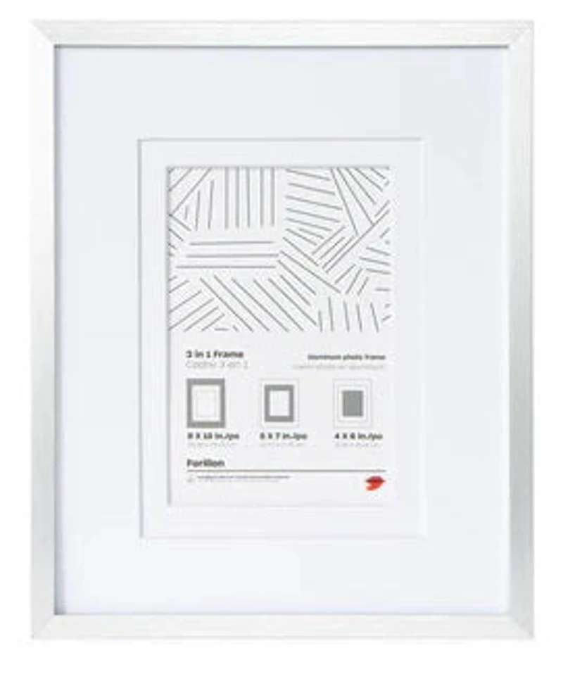 With 3 in 1 Forillon Photo Frames, you get three sizes in one. They feature aluminium moulding for lightweight, elegant, modern and durable framing. Quality frames that blend in seamlessly into any home or office decor. Sizes 8 x 10", 5 x 7", 4 x 6", 12 x 18", 8 x 10" and 5 x 7" have glass panes, while larger sizes have plexi panes.A quality DeSerres product that offers excellent value for money. Made in Canada. Eco-responsible manufacturing with very high standard of energy savings during the manufacturing process. 100% recyclable packaging. DeSerres has developed its own social responsibility program: give back. recycle. recreate.Additional information:What is a mat?A mat is a piece of cardboard (usually with an opening in the centre) that leaves a space between the photo and the frame. It is only suitable for paper artwork, not canvases. When a mat is used, there is usually a glass panel to protect the photo and the mat. Finally, when you see the words "acid-free or conservation", it means that the mat is archival quality and will not fade, yellow or alter the work over time.