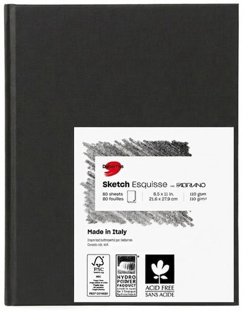 DeSerres par Fabriano. Un carnet d’esquisse de haute qualité avec une reliure cousue, une couverture rigide et un papier sans acide, certifié FSC (papier issu de sources responsables). Il convient au crayon, au pastel, au stylo et à l'encre. Produit avec de l'énergie hydraulique : une fabrication responsable.
