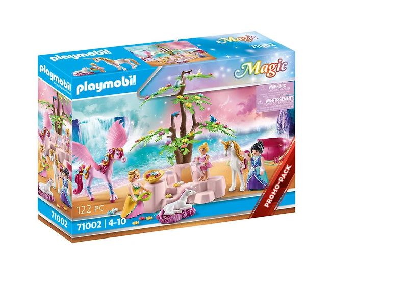 Les princesses décorent leur cheval puis vont aller se promener dans la calèche royale ! Le cheval ailé est vraiment majestueux et les princesses s'occupent bien du jeune poulain ! Dimensions : 16,5 x 14 x 23 cm (LxPxH).