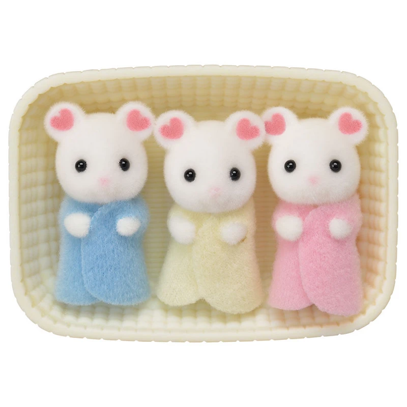 Calico Critters Marshmallow Mouse Triplets, lot de 3 figurines de poupée à collectionner avec accessoire berceau