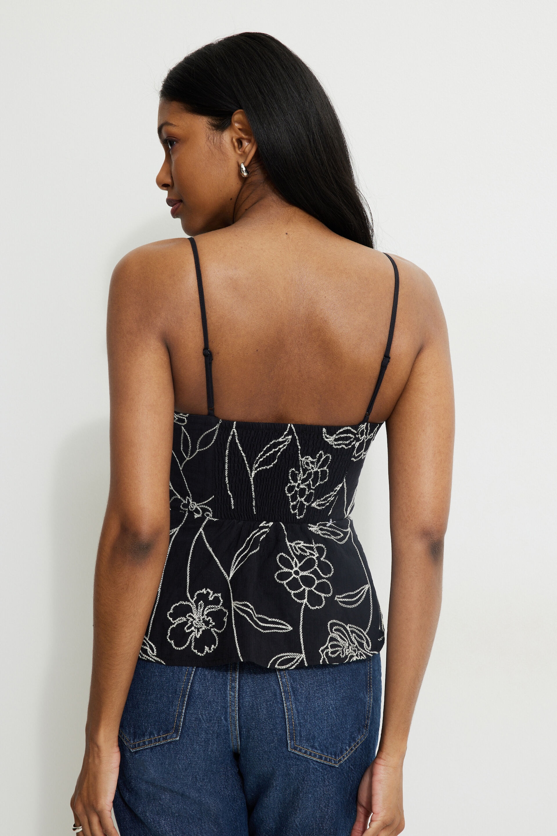 Conçue de manière à épouser votre silhouette, cette camisole est faite d’un tissu façonné léger et aérien. Portez-la avec une jupe pour un look adorable. Caractéristiques Col droit Ourlet à basque Fermeture éclair sur le côté Bretelles spaghetti ajustables Froncée au dos Doublée Taille et coupe Coupe ajustée La mannequin porte la taille TP Composition et entretien 100 % coton Laver à la machine à l'eau froide Importée