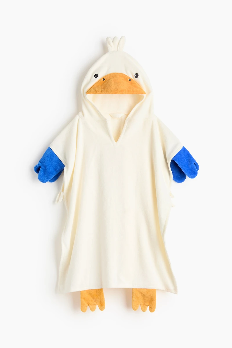 Cape de bain en coton éponge doux avec effet velours sur l'extérieur. Modèle avec capuche agrémentée d'appliqués et côtés ouverts munis de petits liens à nouer.