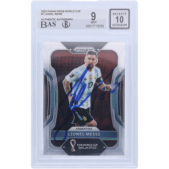Carte 9/10 authentifiée #7 BAS de la Coupe du monde 2022 Panini Prizm Qatar signée par Lionel Messi, équipe nationale argentine
