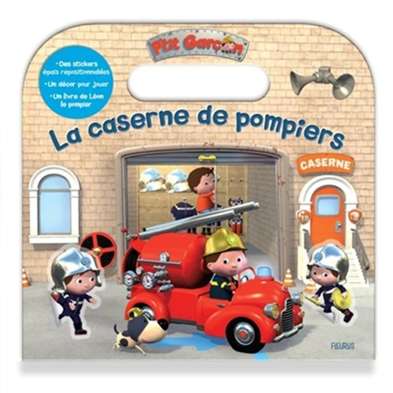 Un livre avec une poignée pour l'emporter partout, avec une histoire, un décor détachable à compléter et des autocollants autour de la caserne de pompiers, dans l'univers de P'tit garçon.