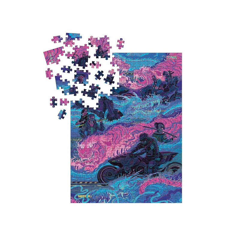 Les membres du gang des "Night City", "Tyger Claws" sont reconnaissables à leurs tatouages Asian, leurs motos rapides, katanas et tantos. Tous sont visibles dans les illustrations du nouveau casse-tête de Cyberpunk 2077. Le casse-tête mesure 20'' x 27''.