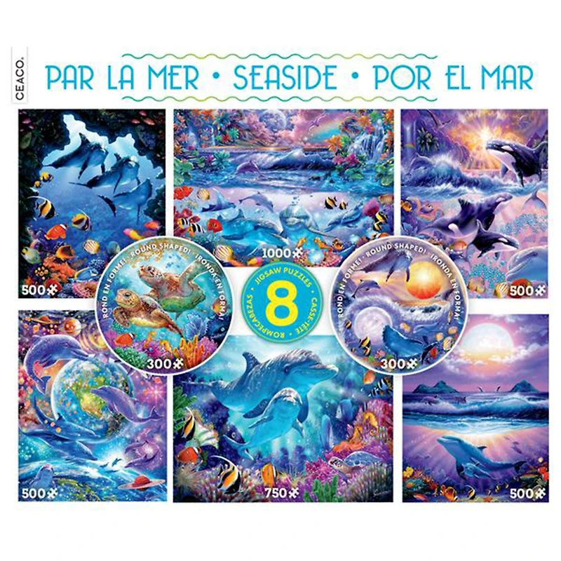 Ce coffret contient huit magnifiques puzzles sur le thème de l'océan. Quatre des puzzles sont de 500 pièces, un de 1000 pièces, un de 750 pièces et deux sont des puzzles ronds de 300 pièces.