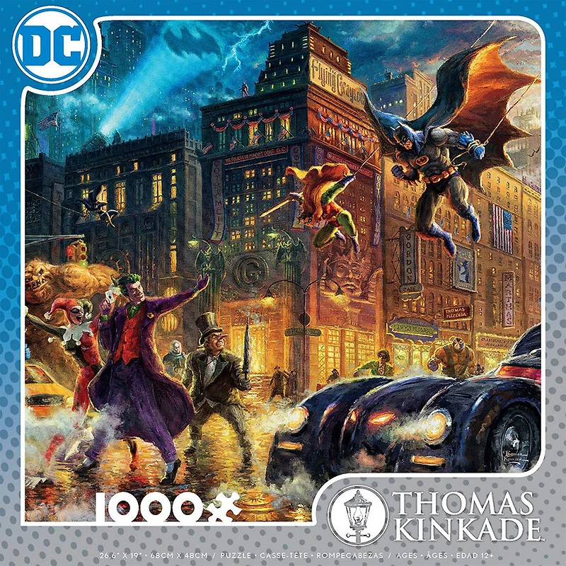 Ce puzzle de 1000 pièces présente une peinture de Thomas Kinkade des super-héros Batman et Robin combattant le Joker du monde de DC Comics.