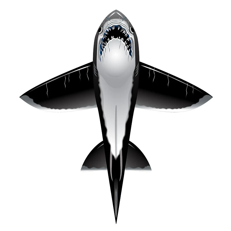 Le cerf-volant X Kites RareAir en forme de requin de BrainStormProducts est fait de nylon, mesure 89 cm (35 po) de largeur et 99 cm (39 po) de hauteur et comporte des motifs réalistes.