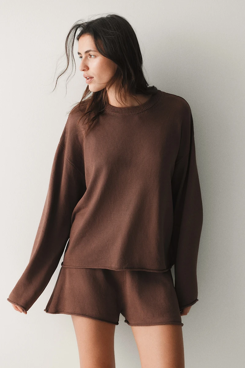Chandail en tricot fin et doux. Coupe flottante avec bande côtelée autour de l'encolure ronde, emmanchures descendues et manches longues. Bord roulotté aux poignets et au bas.