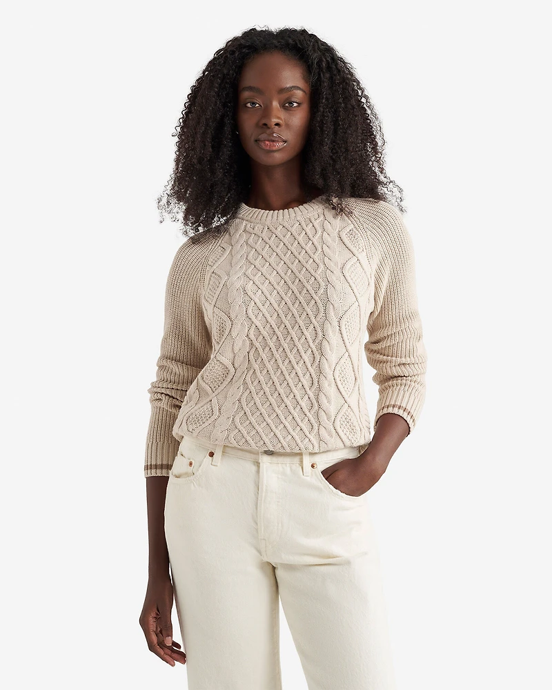 Notre Chandail à col rond Cabane à torsades est un modèle confectionné dans un mélange de coton biologique confortable qui se porte aussi bien lors d’un brunch qu’au bureau.