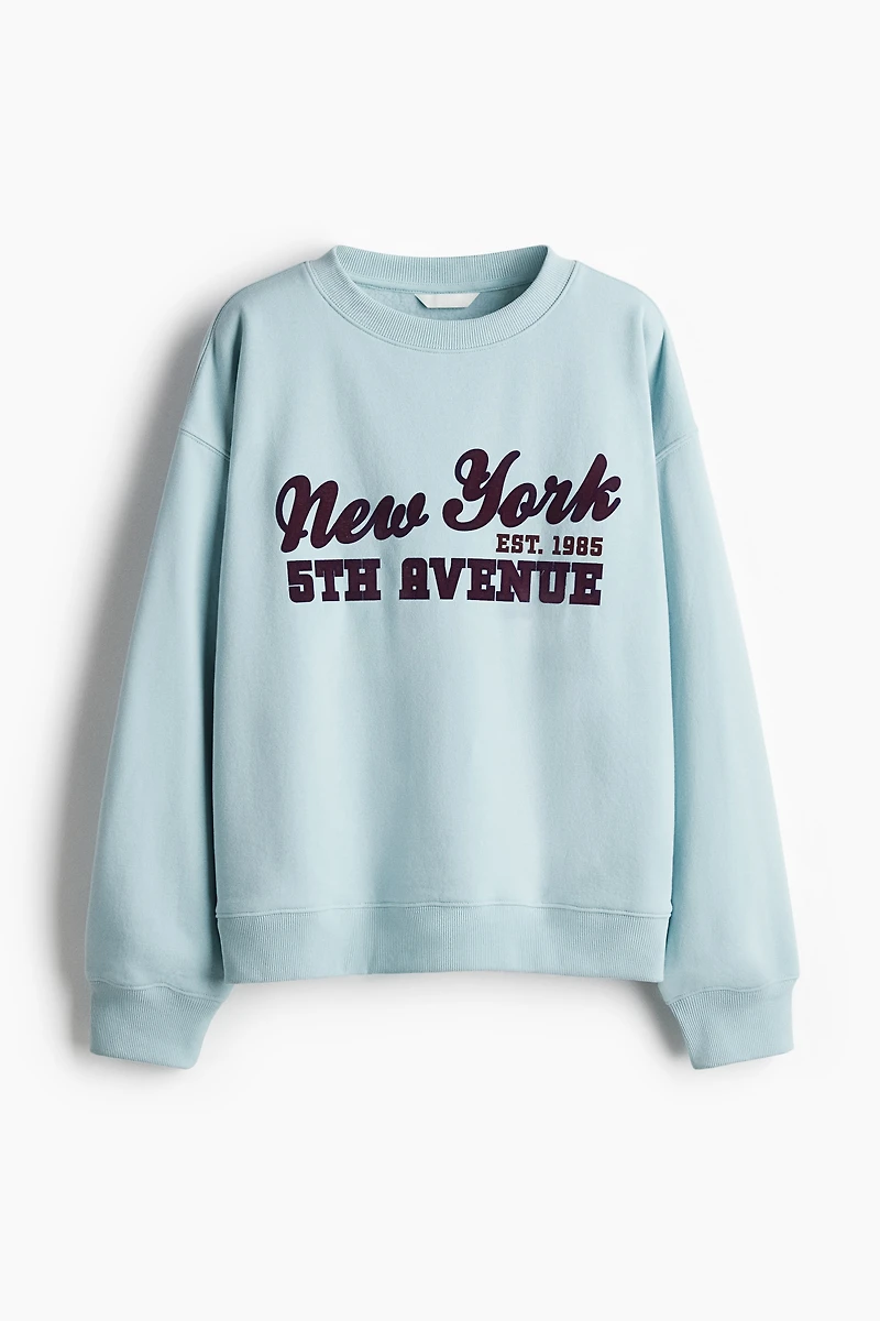 Chandail en molleton à l'intérieur doux et brossé avec texte devant. Modèle grande taille avec bande côtelée autour de l'encolure ronde, emmanchures descendues et manches longues. Finition côtelée aux poignets et au bas.