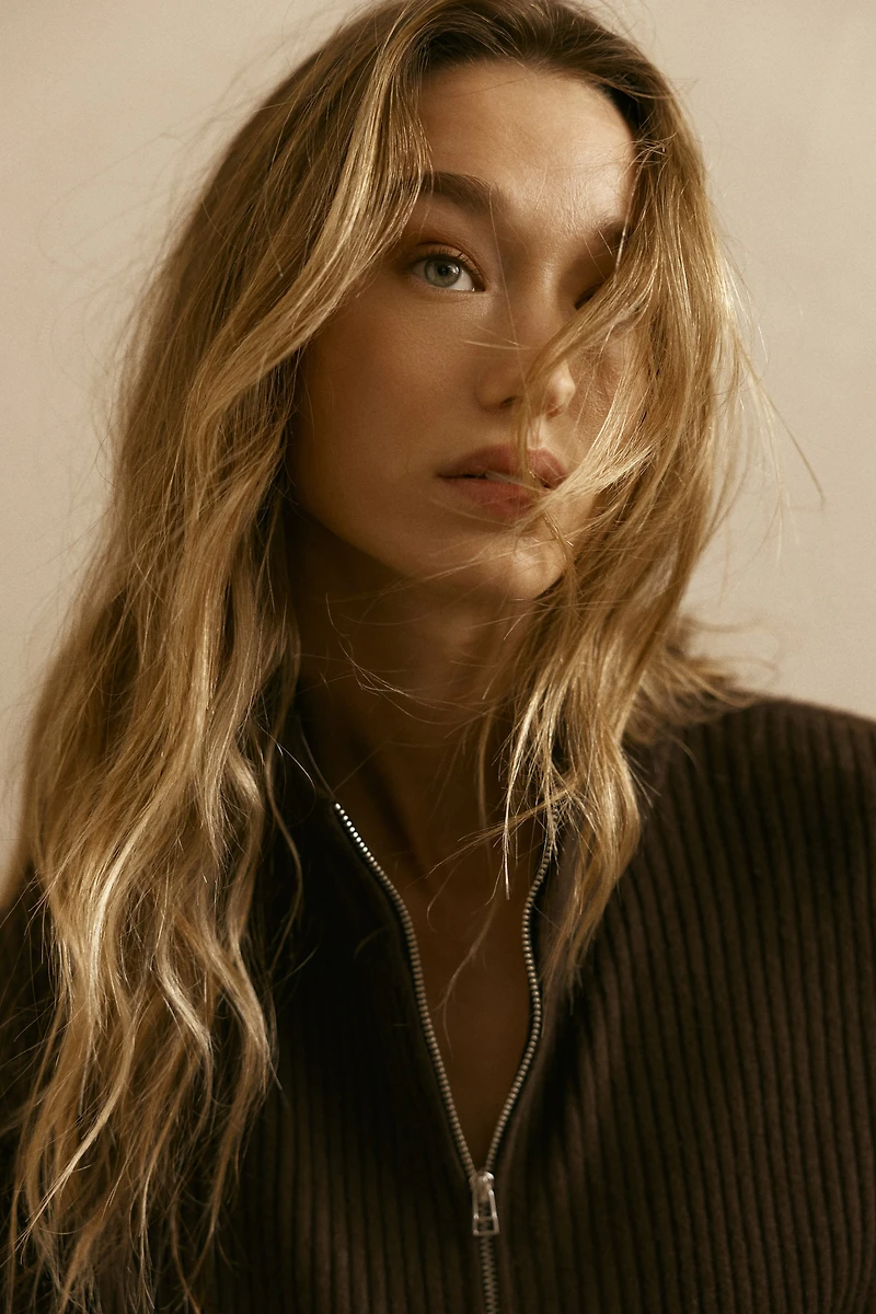 Chandail long et ajusté en doux tricot côtelé. Modèle avec col droit à fermeture éclair.