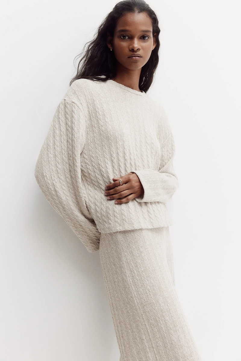 Chandail en doux tricot torsadé. Modèle ajusté avec encolure ronde, emmanchures tombantes et manches longues.