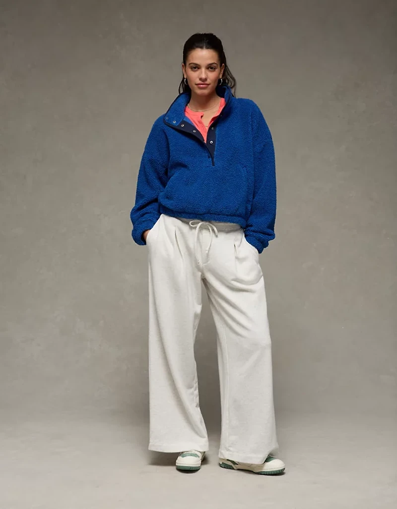 Un chandail en sherpa douillet à coupe décontractée avec une longueur classique et une encolure henley, parfait pour rester au chaud et confortable toute la saison.