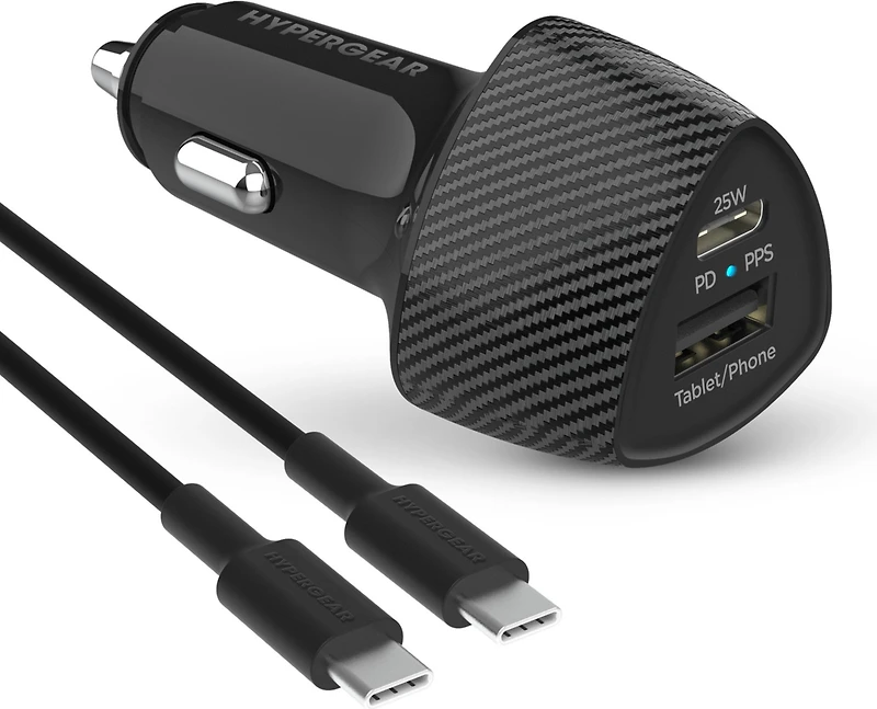Chargeur de voiture SpeedBoost avec adaptateur d’allume-cigare rapide de 25 W USB-C PD et 12 W USB de HyperGear avec alimentation programmable câble USB-C de 4 pi