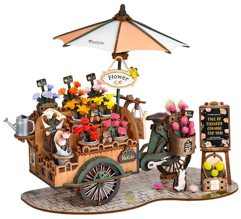 Ce puzzle de 187 pièces présente un chariot en bois de style vintage attaché à un vélo à roues tournantes pour transporter son butin vers les passants ravis du marché. Il est doté d'un parapluie pour protéger les bourgeons de trop de chaleur et d'un arrosoir pour garder les brins frais. Un tableau noir est installé à côté du chariot pour attirer l'attention sur les fleurs, complétées par un petit panier de tulipes jaune vif. Il semble que vous ayez attiré le nez curieux d'un mignon petit chat qui est maintenant assis tranquillement près du chariot, ainsi qu'un papillon jaune qui est actuellement perché sur votre signalisation. Quel que soit l'angle sous lequel vous le regardez, ce chariot est tout simplement irrésistible. C'est un superbe décor dans les endroits où les gens peuvent avoir une vue à 360° ou simplement comme complément à vos autres maisons miniatures et coins lecture Rolife.
