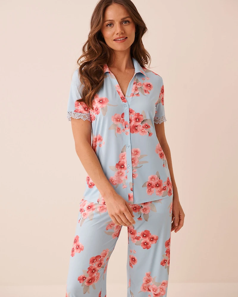 La microfibre pour la légèreté. La dentelle pour le détail. Et un imprimé floral qui appelle le printemps. Ce chemisier de pyjama invite à déconnecter, en douceur.