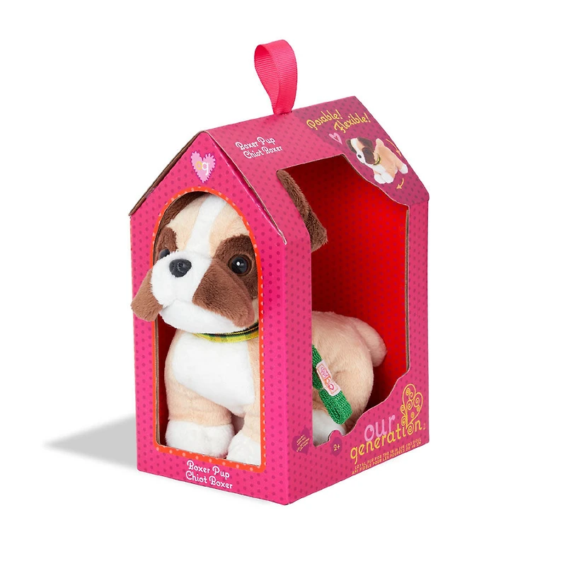 Fais-toi un nouveau meilleur ami poilu avec le chiot boxer articulé par Our Generation! Ce chien en peluche de 15 cm a des pattes articulées qui lui permettent de s'asseoir, de s'étirer, de se coucher ou de donner la patte! C'est l'heure de la promenade? La laisse détachable se fixe facilement au collier et t'aidera à tenir ton compagnon près de toi pendant vos promenades! Sa douce fourrure de peluche est brun foncé et brun pâle, et il est juste de la bonne taille pour apprendre à tes poupées comment s'occuper d'un chiot! (Poupées vendues séparément.)