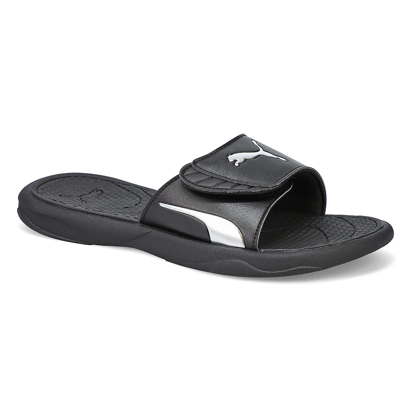 Entrez dans le confort luxueux des sandales Royal Cat comfort slides de Puma. Avec un cuir synthétique souple, une sangle auto-agrippante réglable et une semelle intercalaire et extérieure en EVA moulé, vous glisserez dans votre journée avec style et classe, de la plage à la rue.