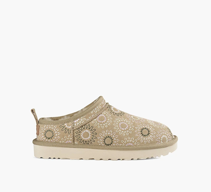 La Classic Micro Sun Stitch apporte une touche originale à une silhouette iconique. Avec son profil bas et ses coutures inspirées du soleil, cette botte allie style décontracté et sophistication subtile. Facile à enfiler et à associer, elle complète parfaitement les tenues du quotidien avec une allure chic et naturelle.