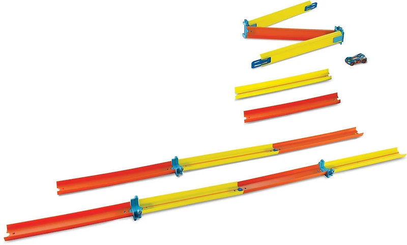 Comprend 3,7m (12pi) de sections de piste droites et 5 connecteurs à charnière qui se plient dans les deux sens pour faciliter le rangement. Comprend 1véhicule Hot Wheels à l"échelle1:64