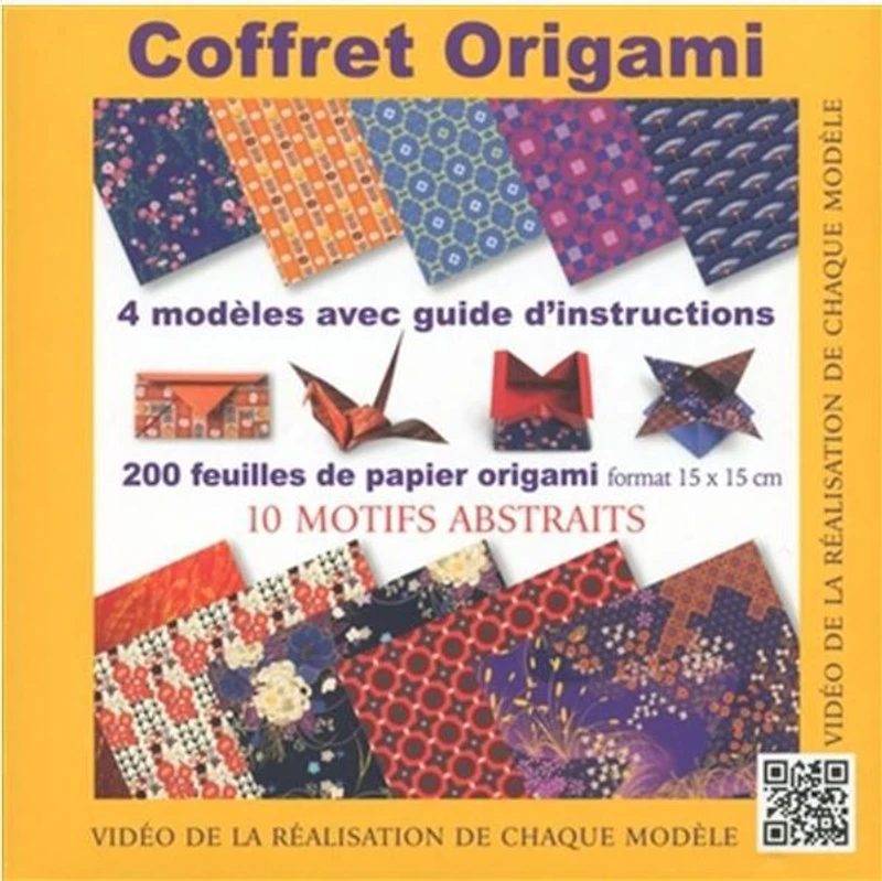Un kit pratique contenant un livre avec des diagrammes et des instructions détaillées pour réaliser 4 modèles aux lignes essentielles et 200 feuilles de papier origami à motifs abstraits.