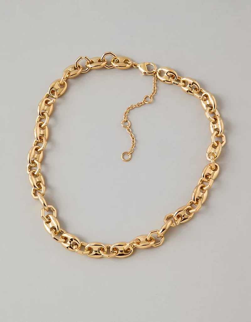 This necklace features a chunky chain and adjustable length.