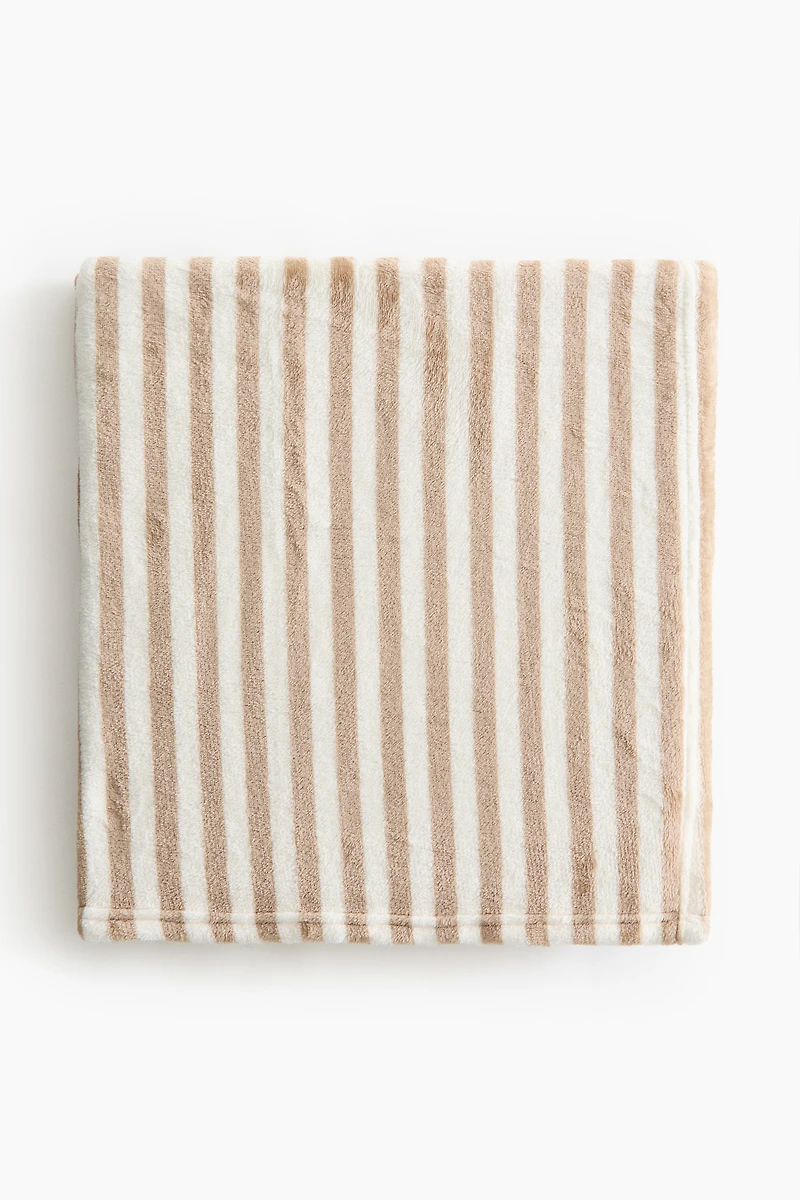 Couverture en polar doux avec motif rayé aux nuances terre apaisantes. Modèle facile à associer avec d'autres pièces textiles.