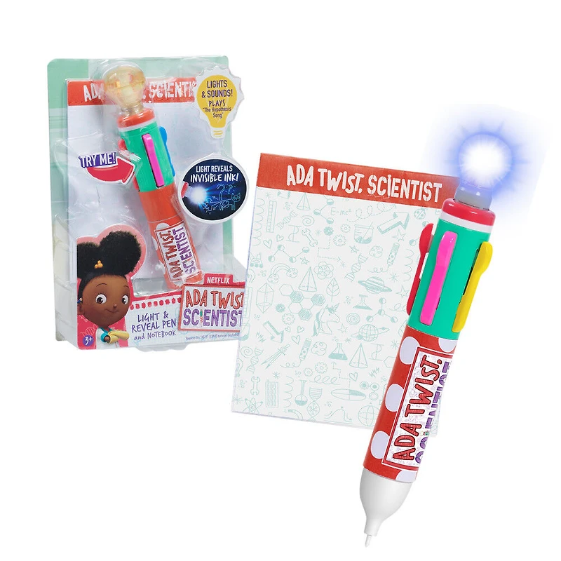 Ce crayon Ada Twist, Scientifique comporte des lumières, des expressions et de la musique et il s'accompagne d'un carnet que les enfants peuvent utiliser pour écrire des messages secrets. Appuie sur le bouton sur le crayon pour entendre Ada chanter la chanson "The Hypothesis Song" !