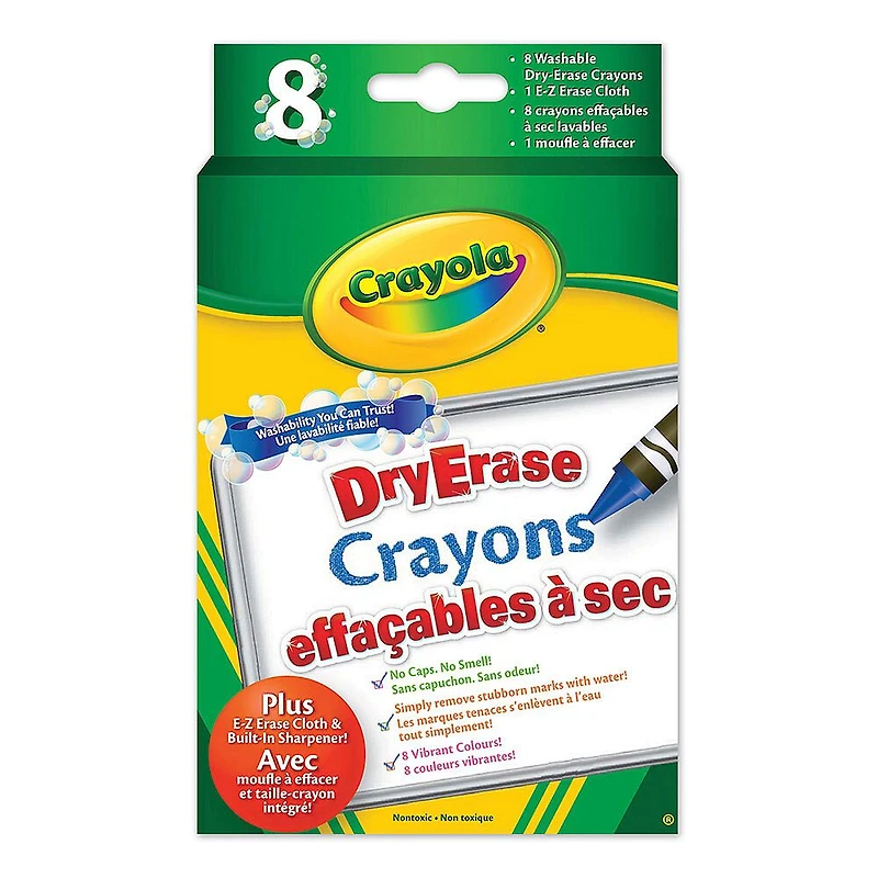 8 crayons de cire effaçables à sec lavables dans rouge, bleu, vert, orange, jaune, violet, brun et noir. Comprend un mitaine E-Z Erase.
