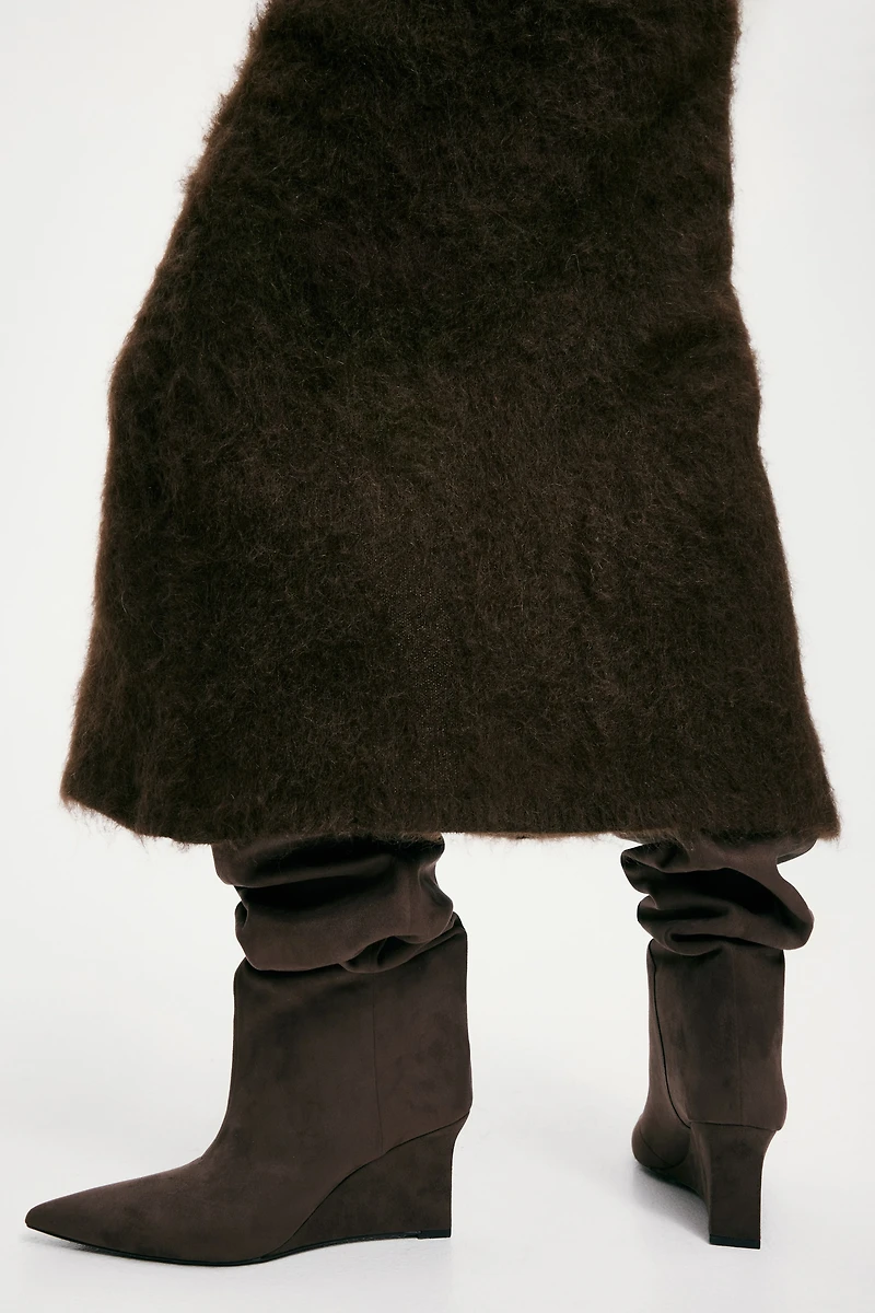 Cuissardes à la douce finition grattée. Modèle à bout pointu avec talon compensé. Doublure et semelle intérieure en jersey.
